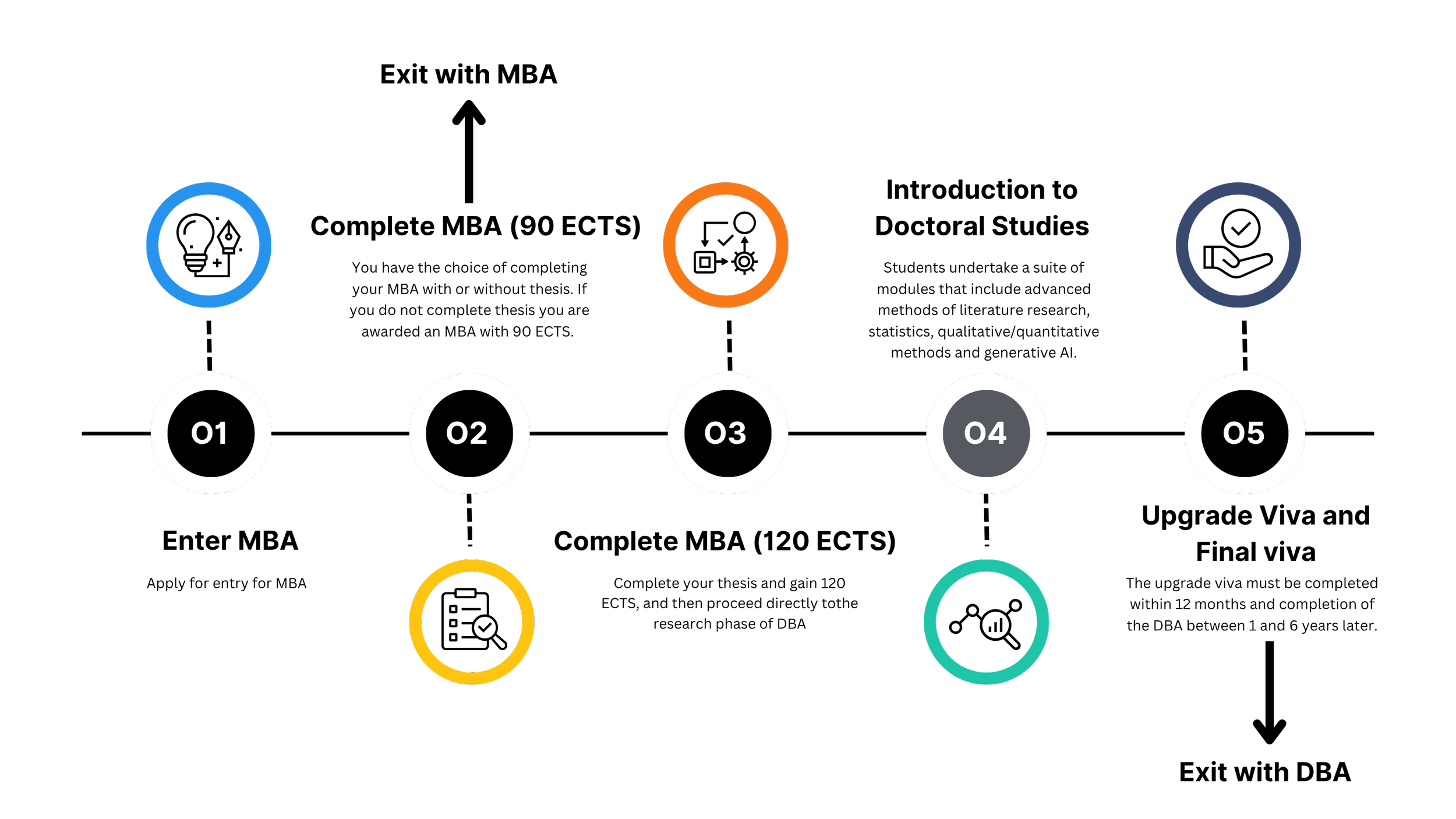 The 120-credit option serves as the gateway to the DBA, where the MBA thesis becomes the foundation for advanced, doctoral-level investigation.